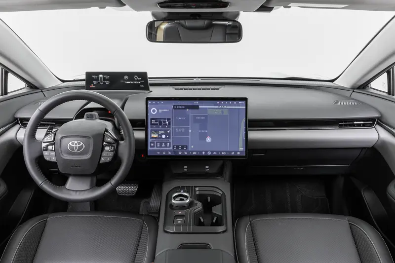 进入到车内,明显的一种既熟悉又陌生的感觉。简约的T字型座舱布局,车内整体采用环抱式座舱设计,悬浮式远端液晶仪表造型与bz3十分相似,不同的是中央则标配一块15.6英寸的悬浮式车机大屏,相比bz3的纵置屏幕,操作与视觉体验都要更加便捷;同时车内大面积的皮质材料应用也让大家一扫此前对于一汽丰田纯电车型那种“简陋”的印象。